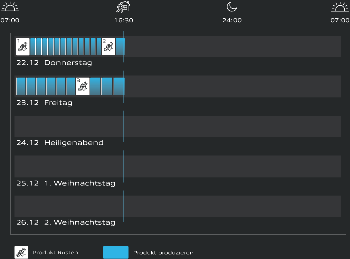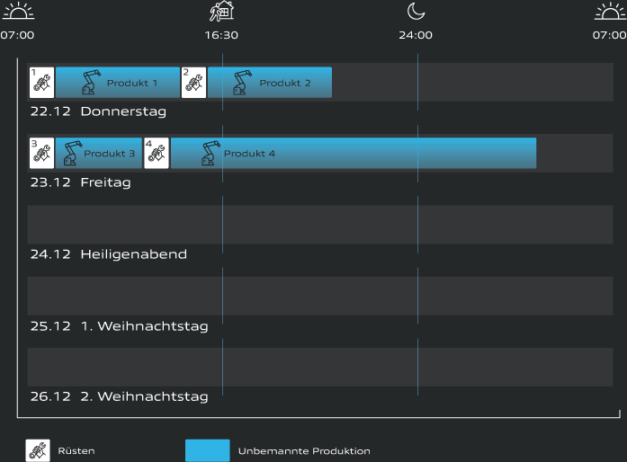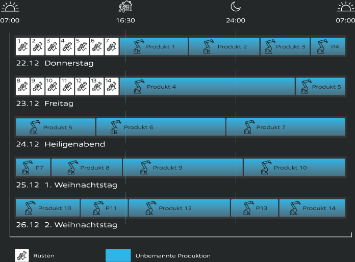Der erste und der zweite Weihnachtsfeiertag fallen 2022 auf einen Sonntag bzw. einen Montag. Heiligabend ist an einem Samstag. Wir gehen einmal davon aus, dass Ihre Mitarbeiter an allen drei Tagen wertvolle Zeit mit ihrer Familie verbringen werden. Von Freitag 17.00 Uhr bis Dienstag 7.00 Uhr sind es also 86 Stunden ohne Ihre Bediener. Wie viele Kleinserien können Sie in diesen 86 Stunden herstellen? Das hängt weitgehend von Ihrer Automatisierungsart ab. Nachfolgend haben wir ein paar Beispiele für Kleinserien für Sie zusammengestellt.