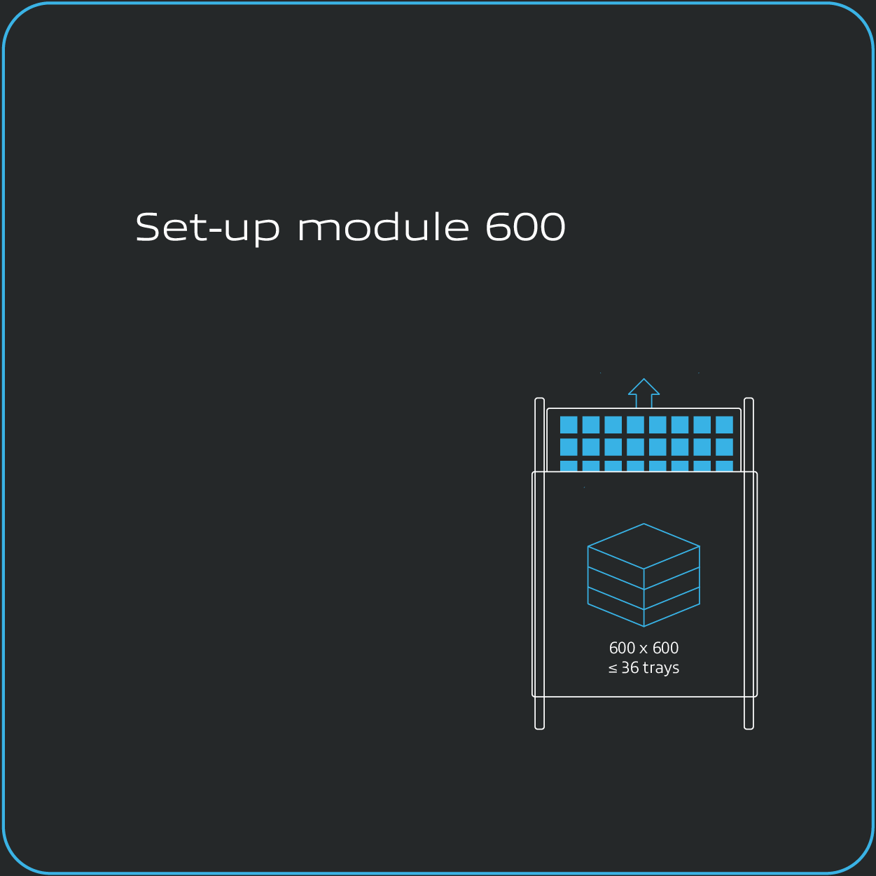 The core of the INFINITY Platform is the Robot module with modular robot capacities from 50 Kg up to 225 Kg. To the left, right or across from this robot module the INFINITY Platform is expanded with other smart modules depending on your needs now and in the future. The base of the robot module is smartly designed to provide an operation place for trays. The robot places the tray here and then sorts out the products of the relevant tray using a product gripper. The vertical part of the robot module provides on the one hand space for the dynamic storage of up to 40 trays and on the other a perfectly accessible and well-organised switch box with all the important controls and other functionalities.