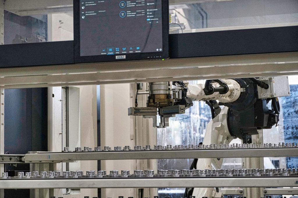 Omdat deze machine slechts twee kanalen door de tafel heeft, kunnen klemmen niet automatisch gewisseld worden. Hierdoor zijn ze beperkt in de afmetingen die ze op de DMU 70 eVo volcontinu kunnen produceren en daarom kiezen ze voor de grotere series op deze machine. De hoge productiviteit komt mede doordat de spindel niet meer stil staat als de medewerkers een nieuw werkstuk programmeren. De toeleverancier uit Eschweiler hanteert een mix van CAM-programmeren en aan de machine programmeren. Dit omdat het belangrijk is dat de CNC operators zich blijven ontwikkelen. Voordat de beide machines geautomatiseerd werden, stond de spil stil als een nieuw werkstuk geprogrammeerd werd. Nu loopt de machine door, de robot zorgt voor het beladen terwijl de vakman aan een nieuw programma werkt.